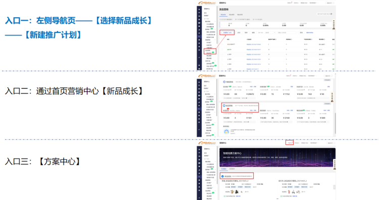 您可以通過(guò)首頁(yè)營(yíng)銷中心【新品成長(zhǎng)】,或者【方案中心】,以及直接【新建計(jì)劃】,來(lái)新建【新品成長(zhǎng)】的計(jì)劃